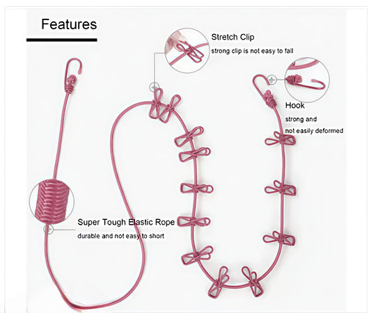 🔥 Buy 2 Get 2 FREE – Elastic Cloth Drying Rope with Hooks & 12 Clips | Travel & Home Use | Windproof & Portable